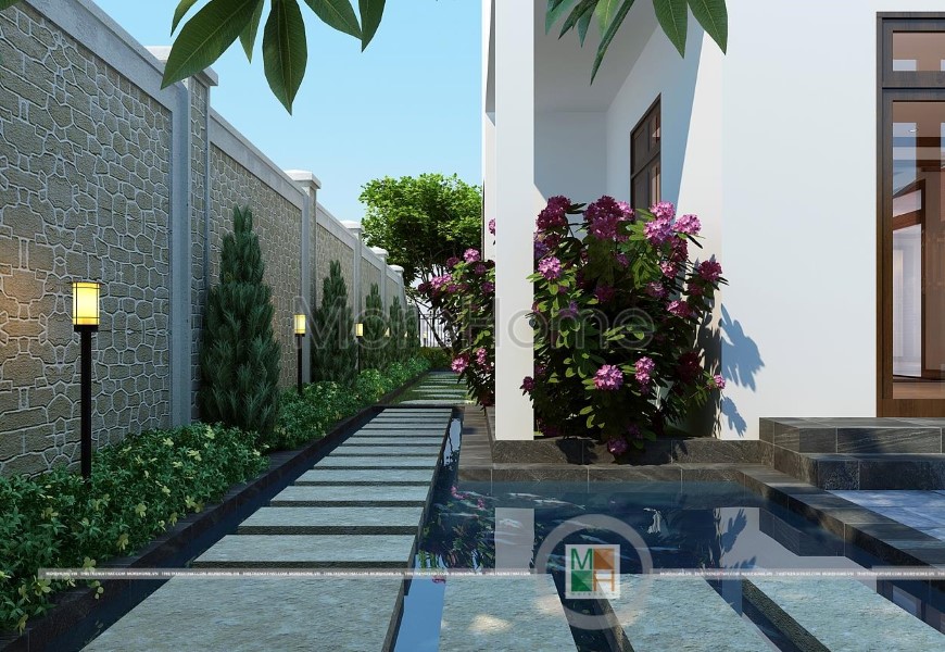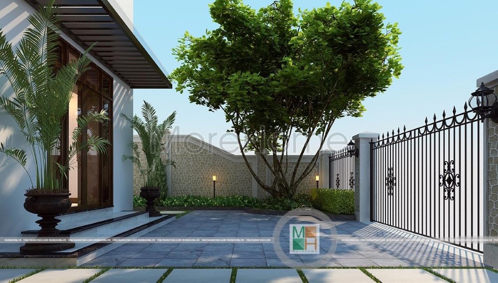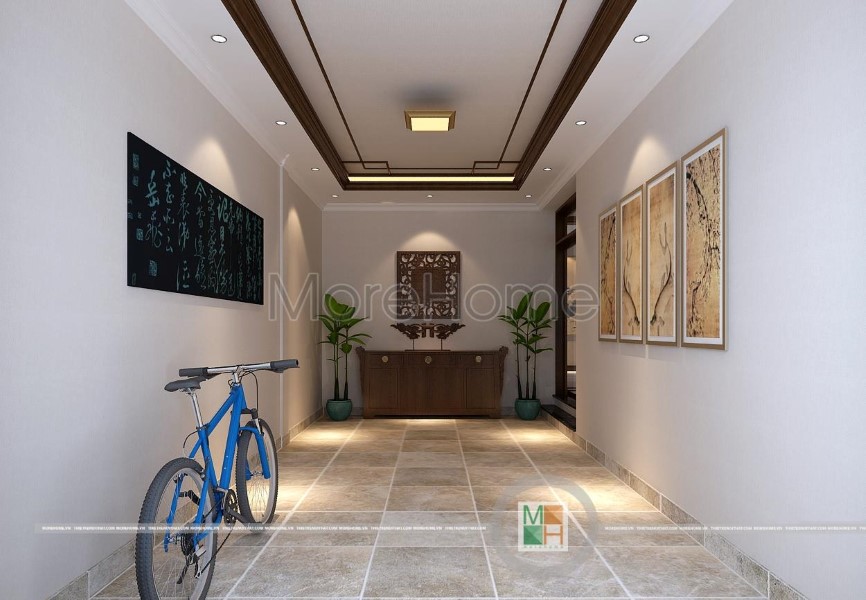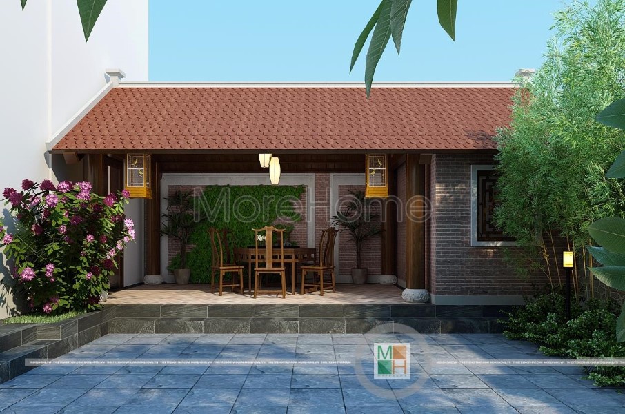 Cầu thang gỗ đi lên tầng 2 thay vì sử dụng lan can thông thường thì trong mẫu thiết kế này để mang tính thẩm mĩ cao vách ngăn gỗ giữa phòng khách được tận dụng làm lan can cầu thang luôn. Khoảng không gian dưới gầm cầu thang luôn bị mọi người bỏ qua gây tối tăm, bụi bẩn. Nhưng KTS tài tình của Morehome lại không bỏ qua bất kì một chi tiết nhỏ trong thiết kế nhà, thiết kế gần cầu thang có cửa sổ lớn để lấy ánh sáng và khiến không gian này thông thoáng hơn. Tận dụng đặt một chậu cây vào sẽ làm bừng sáng cả không gian.