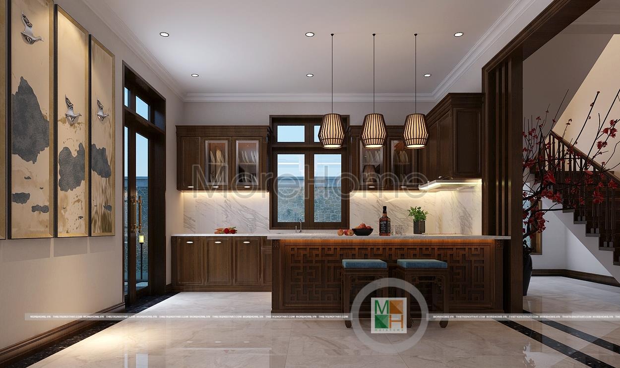 Thiết kế nội thất phòng bếp với tủ bếp gỗ óc chó chữ L với nhiều ưu điểm vượt trội như: tận dụng tối đa góc chết của phòng, phân chia khu vực nấu ăn rõ ràng, tạo nhiều không gian lưu trữ giúp căn bếp luôn gọn gàng ngăn nắp. Với không gian bếp rộng, KTS đã thiết kế chiếc bàn đảo bếp thành quầy bar để gia đình có thể ngồi bên nhau trò chuyện thư giãn.