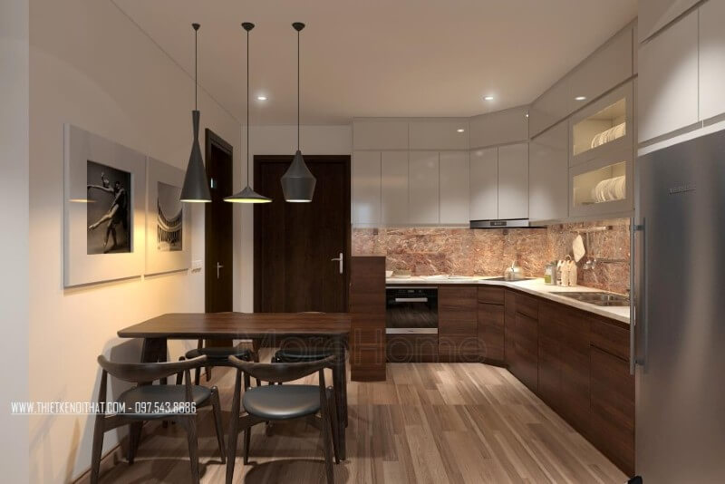 Thiết kế nội thất bếp chung cư và khu vực ăn uống được đặt liền kề mang đến sự tiện nghi cho gia chủ