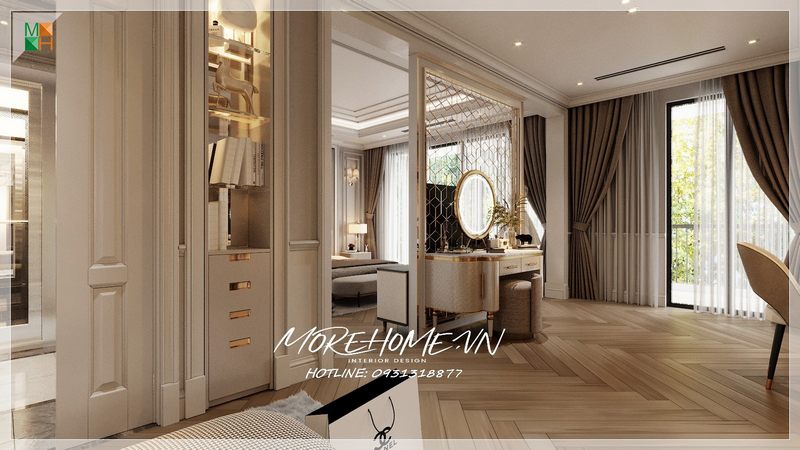 Bàn trang điểm được thiết kế theo phong cách cổ điển có vẻ đẹp thanh thoát và tự nhiên. Đây là sự kết hợp tinh tế giữa yếu tố cổ điển và hiện đại để tạo nên sự nổi bật cho không gian phòng.