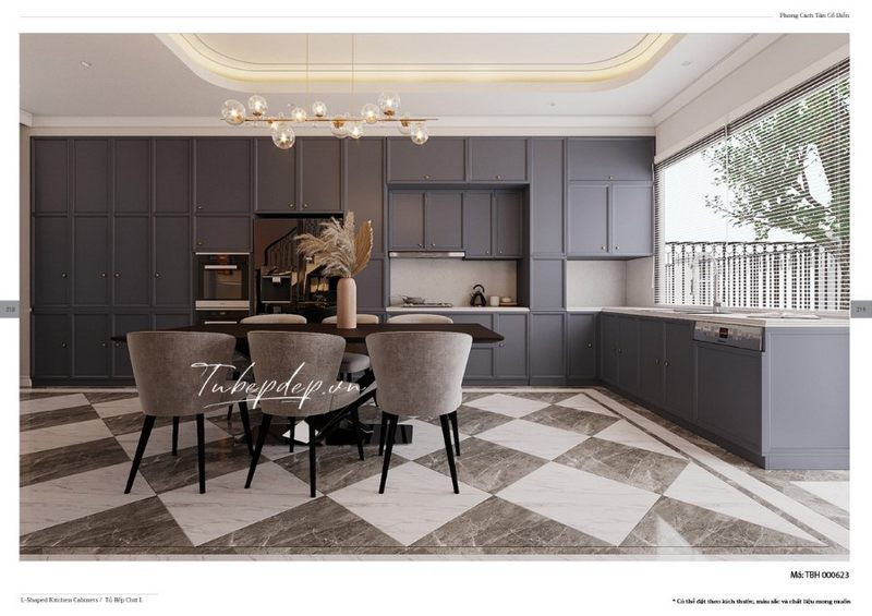 Một sáng tạo mới của các kiến trúc sư khi đặt phòng ăn cạnh phòng bếp trong một không gian thoáng đãng với hệ thống tủ hiện đại màu xanh xám độc đáo dành cho biệt thự, nhà phố