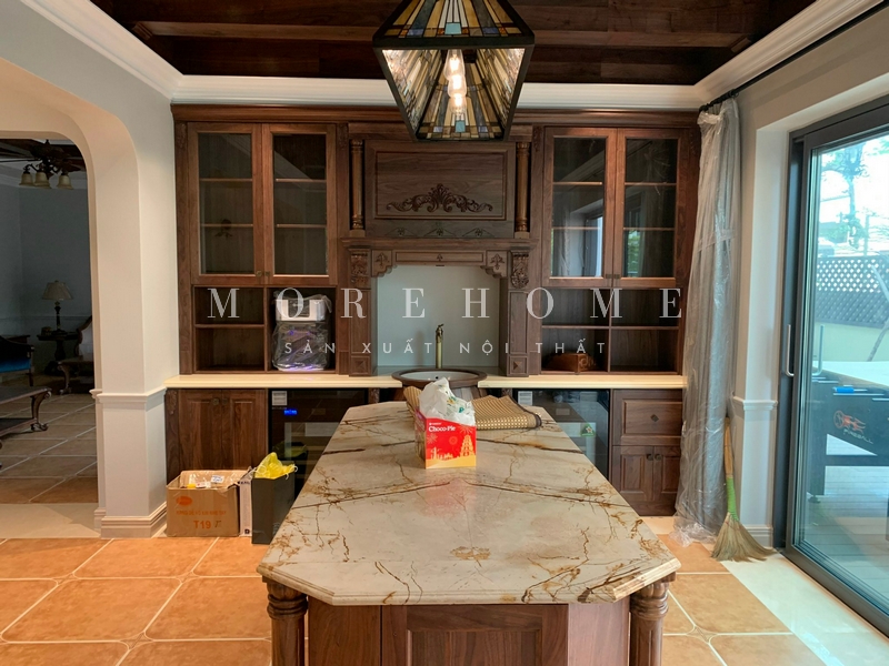 Mẫu tủ bếp tân cổ điển được làm từ gỗ óc chó nhập khẩu cao cấp, được chạm khắc hoa văn cầu kì, tỉ mỉ kết hợp với những màu sắc óc chó sang trọng, tạo nên một không gian cuốn hút, khiến bất cứ ai cũng muốn sở hữu.