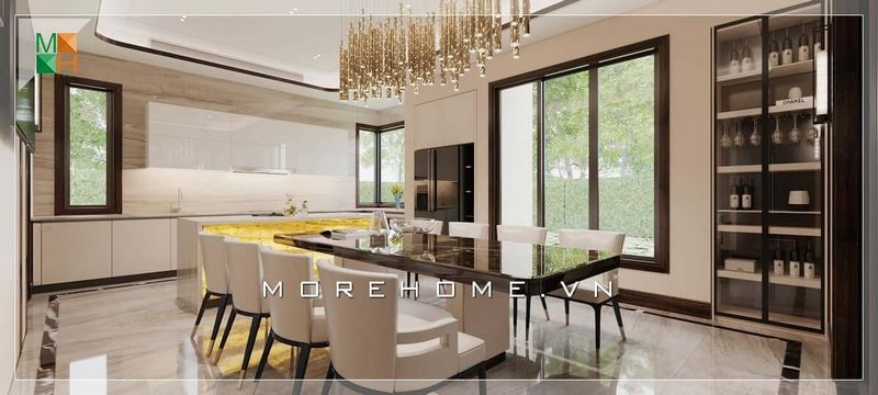 Không gian bếp được thiết kế theo phong cách tân cổ điển và sang trọng, với các thiết bị bếp hiện đại giúp căn bếp trở nên tiện nghi hơn.