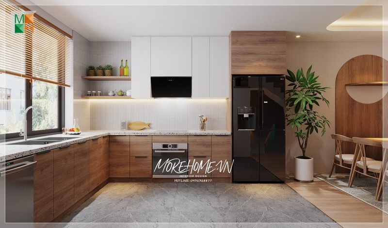 Thiết kế phòng bếp của nhà phố, biệt thự hiện đại được làm bằng tông màu trắng tinh tế, nhã nhặn và rộng rãi, giúp không gian trông sạch sẽ, thẩm mỹ cao.